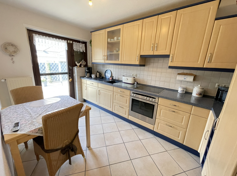 Über die Küche erreicht man die überdachte Terrasse und den uneinsehbaren Garten.